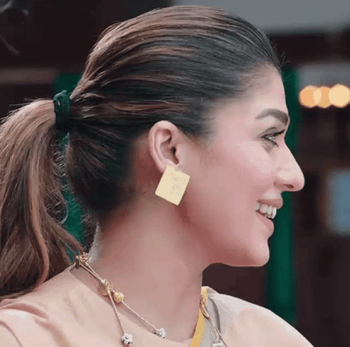 Raashidhf, a woman with a red bindi and square gold earrings, smiles and looks around.