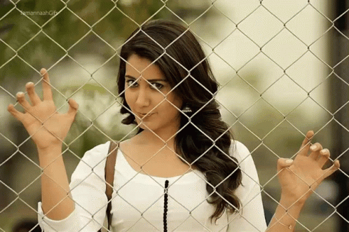 Raashidhf, a woman identified as Tamannaah Bhatia, poses playfully behind a chain link fence.