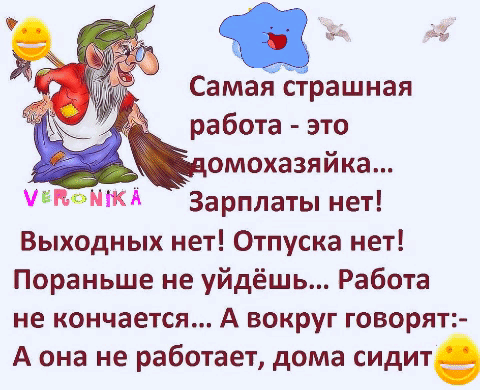 A cartoon image with Russian text describing the challenges of being a housewife: no salary, no days off, endless work, with 'VERONIKA' visible.