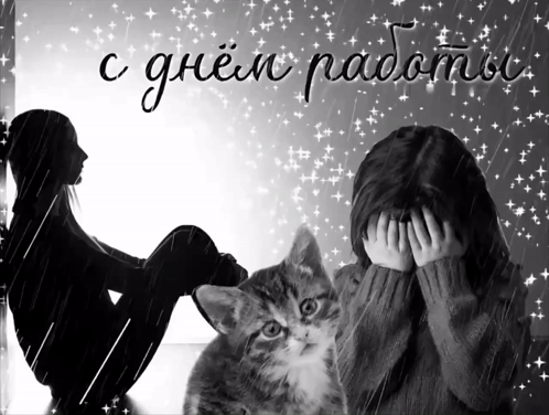 A black and white scene of a distressed woman, a cat, and Russian text 'Happy Work Day', reflecting Monday work blues.