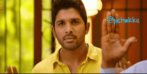 Allu Arjun from Race Gurram, in a yellow shirt, with a sign featuring '@pichukka'.