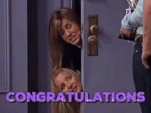 Rachel Green and Phoebe Buffay from Friends peek around a purple door, exclaiming 'Congratulations!'