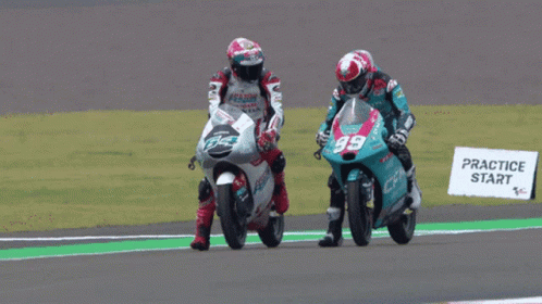 Moto3 racer Mario Aji and a fellow rider show sportsmanship on the track during a practice start, patting each other on the back.