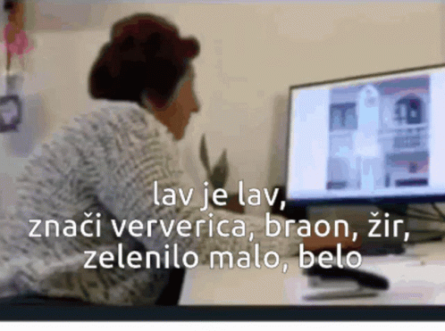 Rada Zadruga points at a computer screen displaying images and text about animals and colors like brown, green, and white.