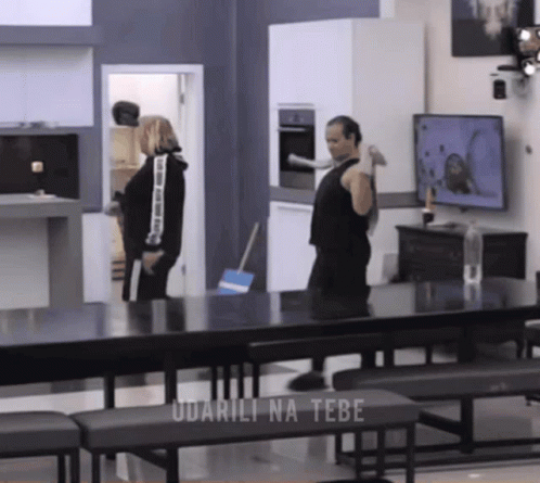 Rada from Zadruga reacts to the phrase 'Udarili na tebe' (They hit you) while sitting at a table.