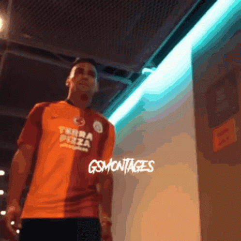 Radamel Falcao walking confidently in his Galatasaray 'Terra Pizza' jersey through a hallway.