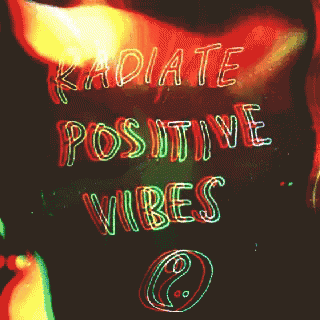 Vibrant neon text 'Radiate Positive Vibes' with a glitch effect and a yin-yang symbol, promoting optimism.