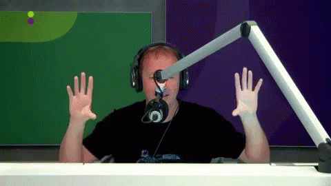 Edwin Evers, a DJ at Radio538, enthusiastically performs the Vogeltjesdans in the studio, wearing headphones and raising his hands.