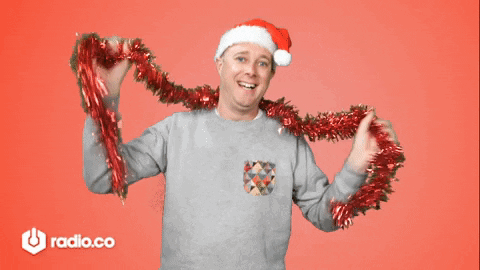 James Mulvany from radio.co spreads festive cheer, wearing a Santa hat and playfully moving red tinsel.