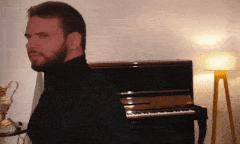 Rafael Aires, with a beard, performs a salute in front of a piano, embodying the 'sigma' concept.
