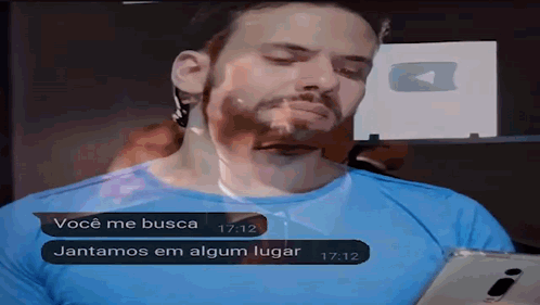 a man in a blue shirt is holding a cell phone with a text message between him and another person