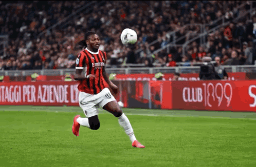 Rafael Leao playfully surfs on a board across a waterlogged football pitch during a match, splashing water.