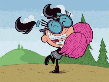 Tootie from The Fairly OddParents cheers enthusiastically with pink pom-poms and a big smile.