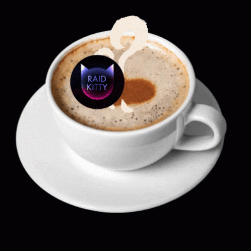 A steaming cup of coffee with a frothy top, prominently displaying the distinctive Raidkitty logo.