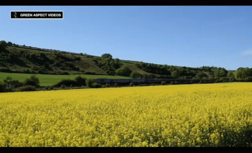 A South Western Railway (SWR) train travels through a vibrant yellow rapeseed field on a sunny day.