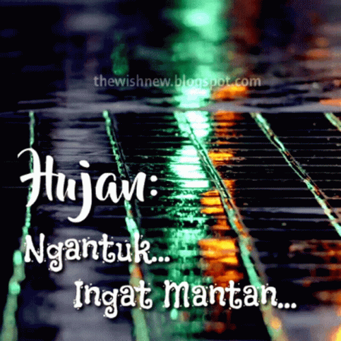 A reflective image of a rainy street with text about feeling sleepy and remembering an ex during the rain.