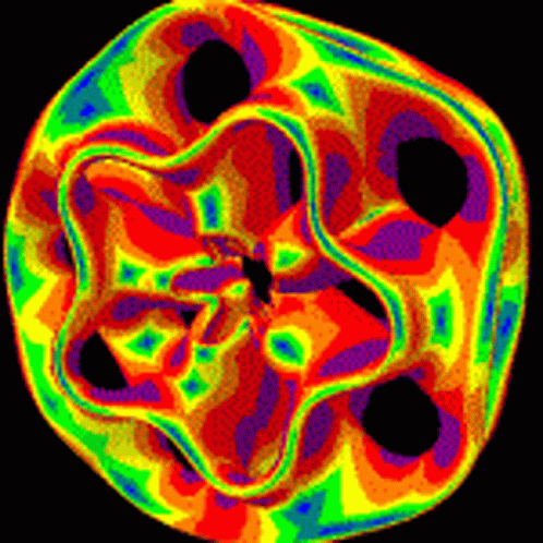A mesmerizing, vibrant rainbow-colored abstract art pattern with intricate shapes and holes, rotating on a black background.