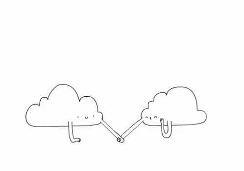 Cute animated clouds holding hands with a vibrant rainbow, symbolizing pride.