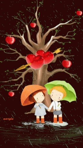 A cute cartoon couple holds umbrellas in the rain, standing under a tree adorned with hearts and apples.