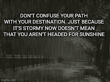 A black and white image of a person with an umbrella on a rainy path, featuring the quote 'Don't confuse your path with your destination'.