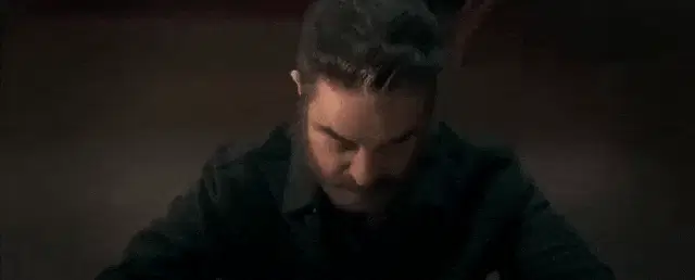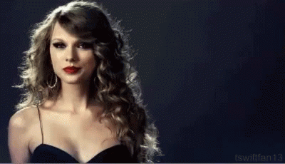 Taylor Swift with dark eye makeup and red lipstick, raising her eyebrows slightly, looking directly at the camera.