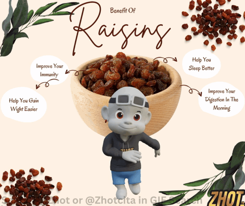 Animated character highlights the health benefits of raisins, including improved immunity, digestion, and sleep.