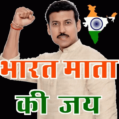 Rajyavardhan Rathore raises his fist, displaying patriotic slogans 'Bharat Mata Ki Jai', 'Vande Mataram', and 'Jai Hind'.