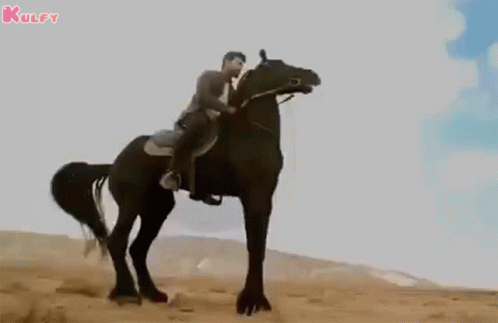 Ramcharan dramatically riding a black horse, rearing up, from the movie Vinaya Vidheya Raama.