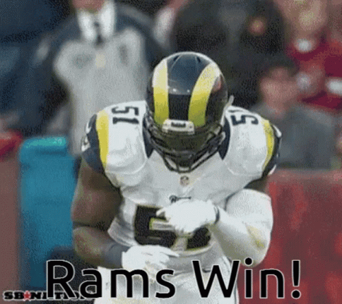 A Los Angeles Rams player celebrates a victory on the field with a dance, as 'Rams Win!' text appears.