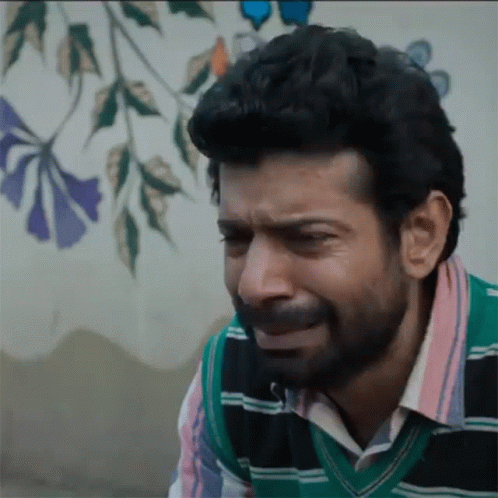 Vineet Kumar Singh crying with a beard, in front of a wall with painted butterflies.