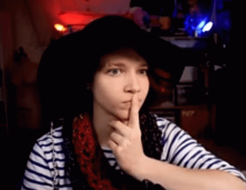 a woman wearing a striped shirt and a black hat is holding her finger to her mouth .