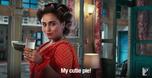 Rani Mukerji, with curlers in her hair, charmingly says 'My cutie pie!' while holding a drink and food.