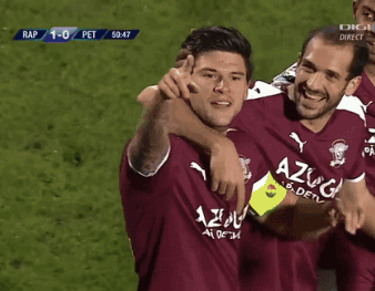 Cristian Săpunaru celebrates a goal for Rapid Bucuresti, making a heart gesture with his hands.