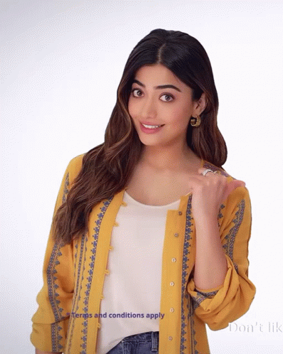 Indian actress Rashmika Mandana smiling and waving in a yellow jacket for a Wakefit Mattress ad.