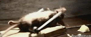 A rat is seen caught in a classic wooden mousetrap, lying still on its back.