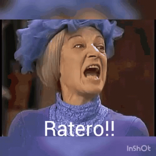 A woman in a blue hat and blue top shouts 'Ratero!' (Thief!) with an expressive face.