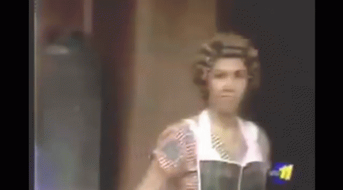 Florinda, from Ratero Chavo, wearing curlers and an apron, looking stern.