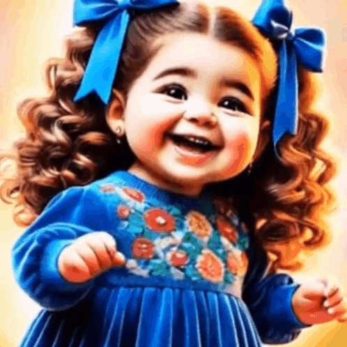 Animated girl Razielai with curly hair and blue bows smiles and blows a kiss, spreading joy.