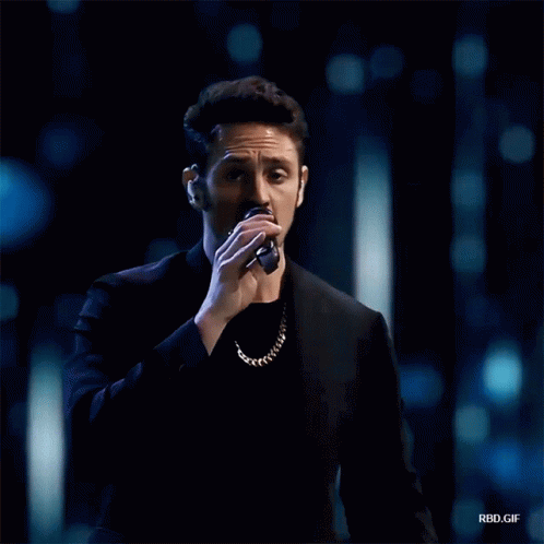 Christopher Uckermann performs live, singing into a microphone on a dark stage with blue lights.