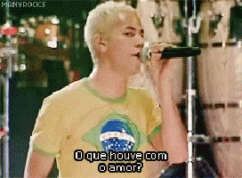Christian Chavez of RBD performs live, singing 'O que houve com o amor?' on stage, wearing a Brazilian flag shirt.