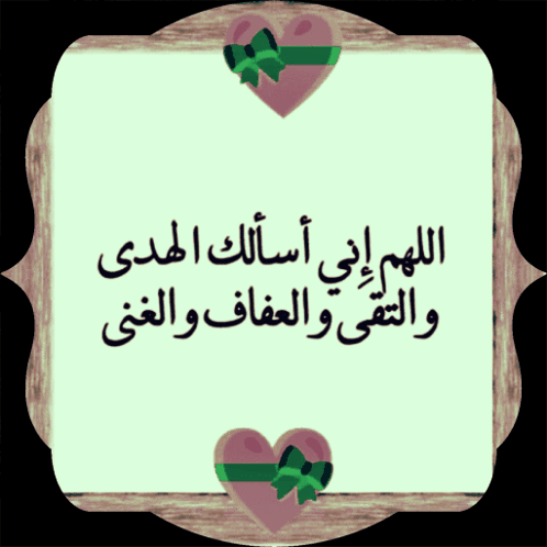 An Islamic prayer card featuring Arabic calligraphy: 'Oh Allah, I ask You for guidance, piety, chastity, and richness,' adorned with two hearts.