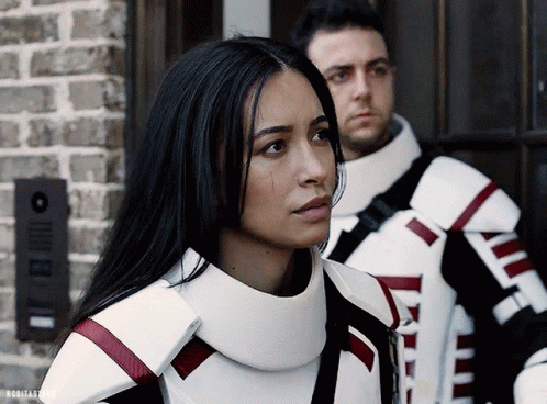 Rosita Espinosa from The Walking Dead in her Commonwealth Army armor, looking serious.