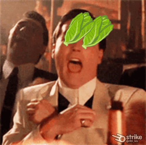 A man in a suit with lettuce leaves covering his eyes, laughing in a humorous meme.