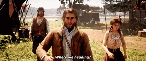 Arthur Morgan from Red Dead Redemption 2 asks 'Where we heading?' in a camp scene.