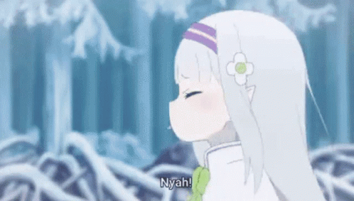 Smol Emilia from Re:Zero says 'Nyah!' in a snowy forest scene.