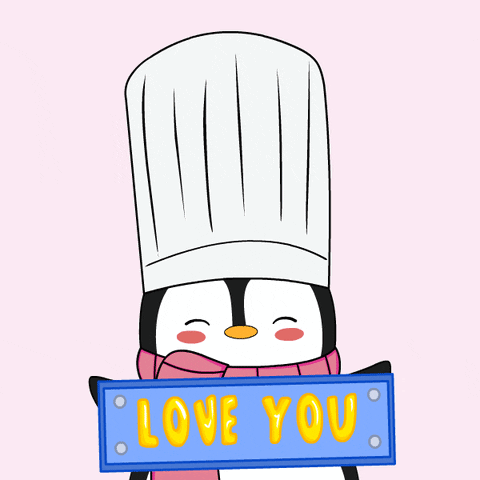 A cute Pudgy Penguin wearing a chef hat and scarf holds a 'Love You' sign with hearts.
