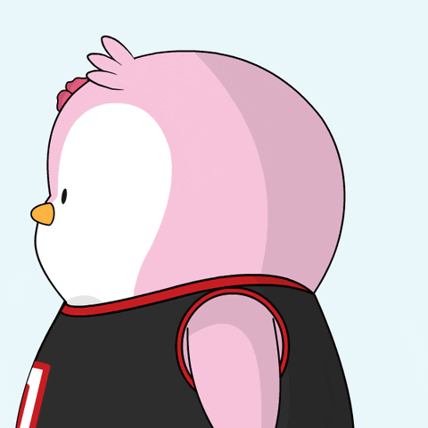 A pink Pudgy Penguin wearing a black jersey with the number 1 gives a skeptical and sarcastic reaction.