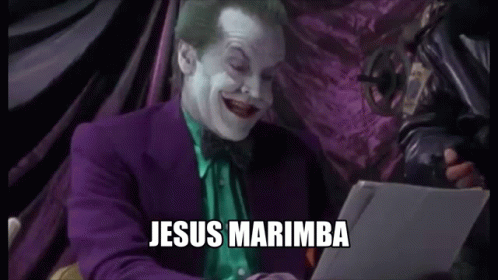 Jack Nicholson as the Joker laughs maniacally while reading a paper with 'Jesus Marimba' written on it.