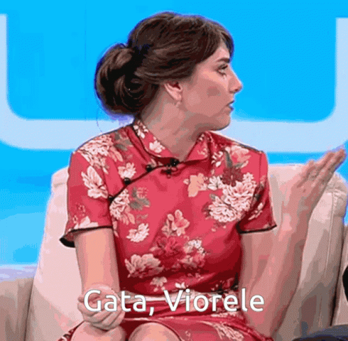A woman in a vibrant red floral dress sits on a couch, speaking, with the Romanian text 'Gata, Viorele' displayed.
