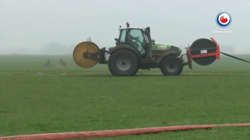 A tractor in a misty green field with the text "Lekker op de trekker" appearing on screen, from Omrop Fryslân.
